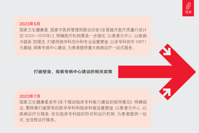 2023年5月,国家卫生健康委、国家中医药管理局联合印发《全面提升医疗质量行动计划(2023—2025年)》,明确医疗机构要进一步强化“以患者为中心,以疾病为链条”的理念,打破传统学科划分和专业设置壁垒,以多学科协作(MDT)为基础,探索专病中心建设,为患者提供重大疾病诊疗一站式服务。2023年7月,国家卫生健康委发布《关于推动临床专科能力建设的指导意见》,明确指出,要探索打破原有的医学学科和临床科室设置壁垒,以患者为中心,以疾病诊疗为链条,优化临床专科组织形式和运行机制,为患者提供一站式、全流程诊疗服务。